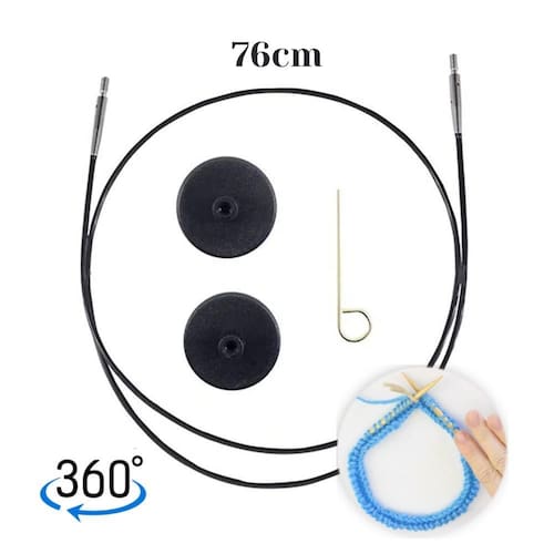 Cabo para Agulha Circular Intercambiável 360º Black Silver - Knitpro Tamanho: 76cm Perfeito para projetos maiores, o Cabo Intercambiável KnitPro Black Silver com tecnologia 360º oferece máxima liberdade de movimento e evita torções, mantendo o fio sempre na posição ideal. Feito com materiais resistentes e flexíveis, o cabo se acomoda de forma plana, sem dobras, sendo fácil de guardar e manusear. Possui união suave, que permite que os pontos deslizem pelas agulhas sem esforço, ideal para quem busca fluidez no tricô. O cabo vem acompanhado de duas tampas de extremidade e uma chave de aperto, que garante uma fixação segura e prática. Projetado especialmente para ser com as agulhas de madeira Ginger da KnitPro. Contém: - 01 Cabo - 01 Chave de cabo. - 02 Tampas de extremidade. Marca: KnitPro Modelo: Cabo Para Agulha Circular Intercambiável. Referência: 1067 Cor: Preto. Dimensões do produto embalado: 10 10 10 cm. Marca: Não Informado