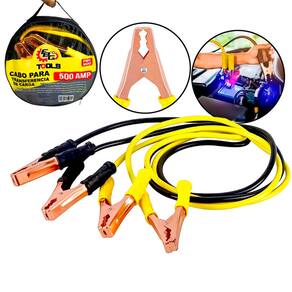 Capacidade: 500 AMP Comprimento total do cabo: 2,20 metros Comprimento dos condutores: 1,95 metros Material do revestimento: PVC resistente a calor, óleo e ácido Braçadeiras: Em metal com isolamento total Compatibilidade: Veículos automotivos 12V Acessório incluso: Bolsa de transporte com zíper e alça Indicação de uso: Transferência de carga entre baterias