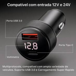 Especificações: - Display Digital: Voltagem em tempo real 12v a 24v - Portas USB: 1x USB 3.0 + 1x Tipo-C PD para carregamento rápido - Tecnologia PD + QC 3.0 - Carregamento super rápido e estável - Cabo com 03 Metros de comprimento - Compatível com Starlink Mini - Vedação Dupla à Prova d Água