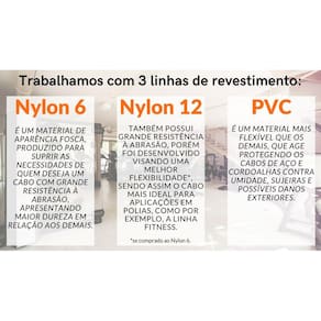 Cabo de aço revestido para academia, possui também outras aplicações. Cabo em aço galvanizado diâmetro de 1/8" alma de fibra e revestimento NYLON 6 na cor preta. Especificação: CA Galvanizado 1/8" 6x19 AF 3,20mm Revest. em NYLON 6 preto final 4,80mm. OBS: Garantia apenas contra defeitos de fabricação, não cobre mau uso. *Temos também na opção de 100m, pvc ou nylon 12, consulte nosso perfil*