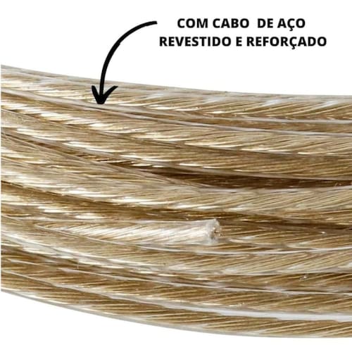 - Marca: Nacional; - Referência: 19043; - Material: Cabo de aço revestido em termoplástico de alta qualidade; - Cor dourada, discreto para sua lavanderia; - Produto reforçado; - Revestido em PVC; - Maleável; - Fácil instalação; - Acabamento liso e uniforme; - Atende a varais de teto e de parede.