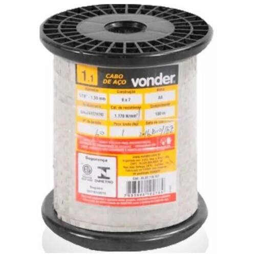 O Cabo de Aço Vonder é indicado para instalação de cerca elétrica, manutenção de vidro elétrico de veículos, entre outras funcionalidades. Indicado para cargas estáticas e operações sujeitas a atrito. ATENÇÃO: para segurança e do produto, mantenha sempre a etiqueta com o selo de conformidade do Inmetro junto à bobina do cabo de aço. Possui ótima resistência à abrasão, pouca flexibilidade e maior resistência à corrosão e oxidação. Características do cabo: Diâmetro do cabo de aço: 1/16 - 1,59 mm Tipo de alma do cabo de aço: AA - Alma de Fibra Construção do cabo de aço: 6 x 7 Comprimento da bobina do cabo de aço: 100 m Tipo de torção do cabo de aço: TRD - torção regular a direita Qualidade da camada de zinco do cabo de aço: B Norma do cabo de aço: ABNT NBR ISO 2408 Construção da perna do cabo de aço: 1-6 Categoria de resistência do cabo de aço: 1770 N/mm² Carga de ruptura mínima do cabo de aço: 1,61 kN Carga de ruptura mínima do cabo de aço: 164 kgf Lubrificação no cabo de aço: Não Marca: Não Informado