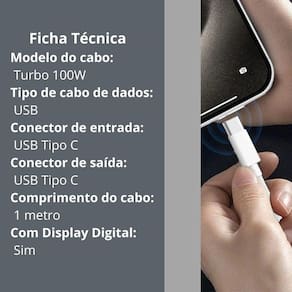 Cabo de carregamento e dados USB-C para USB-C de 1 metro, com potência de até 100W 6A, display digital integrado para acompanhamento da potência em tempo real e construção reforçada.Tipo