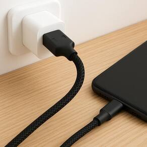 Cabo de dados USB para Tipo C com 1 metro de comprimento, feito com malha trançada de nylon super resistente. Suporta carregamento turbo.