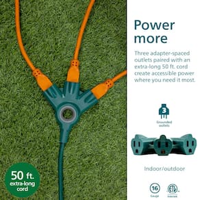 Philips EZGrip Cabo de extensão externo com várias tomadas, cabo de 3 pinos aterrado, cabo de extensão longo interno com várias tomadas, cabo de extensão resistente, 15 m, 16 AWG, verde, - Design EZGrip – Alças ergonômicas integradas facilitam a conexão e desconexão rápida e segura de eletrônicos, ferramentas elétricas, decoração de férias e muito mais — um produto CES 2023 Innovation Award - Alcance estendido – Com três saídas aterradas em um design de ventilador alargado, este cabo extra longo de 15 metros é ótimo para decoração sazonal, bem como aparelhos e ferramentas como brocas manuais e serra de vaivém que exigem um alcance estendido - Resistente – O cabo de isolamento duplo e o plugue moldado oferecem durabilidade extra; a jaqueta de vinil resistente protege contra umidade, poeira e sujeira para melhorar a longevidade - Multiuso: use este cabo de extensão interno/externo em sua garagem, quintal, pátio e outros lugares para ferramentas, equipamentos de gramado, iluminação externa e decorações de feriado; jaqueta verde escura combina bem com decoração sazonal e paisagismo - Especificações – Este cabo de extensão aterrado de três fios e 16 AWG é classificado para 12 VAC/13 A/1625 W e estende três saídas aterradas de três pinos em um design alargado de qualquer receptáculo CA aterrado; listado por ETL