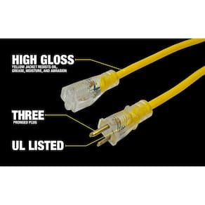 Este produto é compatível com tomadas que suportam 110 volts e pode exigir um conversor quando utilizado fora dos Estados Unidos. Jaqueta amarela 2884 12/3 Cabo de extensão SJTW pesado de 15 A com extremidades iluminadas, ideal para equipamentos e ferramentas pesados, plugues moldados transparentes duráveis, jaqueta amarela de alto brilho, 50 pés — pesado