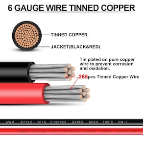 Fio de calibre 6 – iGreely Cabo de fio elétrico de cobre estanhado de 3 m vermelho e 3,5 m preto 6 calibre para áudio de carro, trailer automotivo, fiação de chicote marítimo 6AWG 3,5 m - Listado na UL1015: Cabo de cobre estanhado 6 AWG, 265 fios de fio de cobre estanhado de 0,254 mm, protegendo-os da corrosão e fácil de soldar. - O isolamento do revestimento de PVC é espesso e resistente, bem revestido. - Ampla faixa de temperatura: -60 °C a 105 °C, a tensão nominal é de 600 V, resistente a ácidos, álcalis, óleo e oxidação forte. Químico, chamas, envelhecimento, resistente ao clima e eletricamente isolante. - Ótimo para rádio de áudio, marinho, home theater, automotivo de 12 V e motocicleta, potência do amplificador, trem modelo, eletrodomésticos, aparelho de aquecimento elétrico, luz LED de baixa tensão. - Conformidade com os padrões de segurança: este fio adere ao padrão de segurança UL1015, garantindo que atenda aos requisitos necessários para segurança e desempenho, dando a você tranquilidade ao usá-lo em seus projetos de fiação.