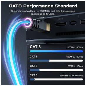 F , FTP Velocidade O cabo Ethernet Cat8 é feito de 4 pares blindados F , FTP e fios OFC de fio único 26AWG que suporta largura de banda de até 2.000 MHz e aumenta a velocidade de transmissão de dados em 40 bits Gbps. Com uma blindagem adicional, Cat8 pode reduzir qualquer interferência de sinal em toda a extensão. Permite que você faça stream de vídeos HD, música, navegue na internet, jogue e alta velocidade. Design premium com grande qualidade