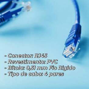 Cabo De Rede 5 Metros Pacote Kit Com 7 Cabos Cat5e Azul Como autoridade reconhecida na área de Informática e Computação, estamos empenhados em fornecer a você uma experiência tecnológica excepcional. Temos tudo o que você precisa para montar seu escritório dos sonhos, desde computadores e cadeiras gamer de alto desempenho até acessórios essenciais. Conectividade Sem Limites: Pacote com 7 Cabos de Rede de 5 Metros - Garanta Sua Rede Sempre ConectadaApresentamos o pacote perfeito para garantir a conectividade e a performance da sua rede: o conjunto com 7 cabos de rede de 5 metros. Com esses cabos, você terá a liberdade de estender suas conexões de internet em diferentes ambientes, seja em casa, no escritório ou em ambientes corporativos.Especificações do produto: - Conector: RJ45- Revestimento: PVC- Tipo: LAN/CFTV- Comprimento: 5m- Cor do cabo: azul-tipo de cabo de rede: 4 Pares-conector de entrada: RJ-45-conector de saída: RJ-45-impedância: 100 +/- 15Ohms-revestimento: PVC Retardante a Chamas CMX-aplicações: Todos os tipos de redes, suportando conexão gigabit-bitola: 0,51mm fio Rigido-frequência: 100Mhz-condutores: 8x0,51mm 4 Pares -composição: Alumínio Cobreado, Plastico PEAD, PVC- Certificação Anatel para componente, de acordo com os novos requisitos vigentes. Conteúdo da Embalagem:7x Cabos de Redes 5 metros Imagens Meramente Ilustrativas Qualquer dúvida estamos a disposição Marca: Strong Tech