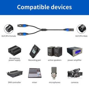 - Compatibilidade: os cabos divisores XLR são compatíveis com dispositivos equipados com conectores XLR de 3 pinos, como mixers, câmeras, amplificadores, alto-falantes, microfones e amplificadores de potência. O comprimento total do cabo é de aproximadamente 2 pés, com o divisor Y a aproximadamente 1 pé do conector XLR em cada extremidade. O pacote contém um cabo Y azul e um preto de 2 pés XLR macho para duplo XLR fêmea