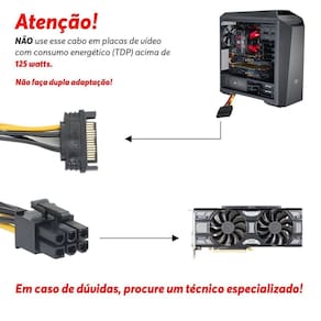 Cabo Energia Alimentação Sata Macho para PCI-e PCI Express 6 Pinos Cor: Preto O cabo de energia SATA macho para PCI Express de 6 pinos é para fornecer energia adicional a placas de vídeo que exigem mais energia do que a fornecida pela placa-mãe. Esse cabo é geralmente para conectar a fonte de alimentação do computador à placa de vídeo, fornecendo energia para a placa e permitindo que ela funcione corretamente. O cabo tem uma extremidade SATA macho, que é conectada à fonte de alimentação do computador, e outra extremidade com um conector de 6 pinos, que é conectado à placa de vídeo. É importante observar que nem todas as placas de vídeo exigem esse cabo de alimentação adicional e que a utilização do mesmo depende das especificações da placa de vídeo e da fonte de alimentação do computador. Especificações: Material: PVC + Puro Cobre Cor: Preto/Amarelo Comprimento: 20cm Fio: 18AWG 1007 Conector Entrada: Sata Macho Conector Saída: 6 Pinos PCI Express Macho Atenção Utilize esse adaptador somente em placas de vídeo com consumo energético TDP de até 125watts. Não faça adaptação com outros cabos Em caso de dúvidas procure um técnico especializado Marca: Não Informado Ean: 6904053004135
