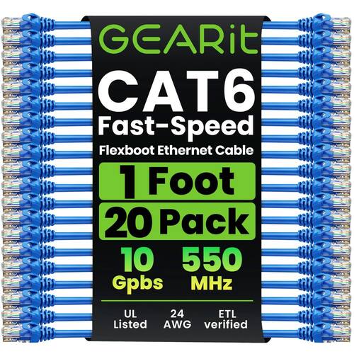 Pacote com 20 cabos de conexão GearIt Cat6, cabo Ethernet Cat 6 de 1 pé, aba flexível flexível e flexível - Série Premium - Azul