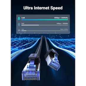 Largura de banda estável de até 2000MHz: o cabo Ethernet UGREEN cat 8 suporta largura de banda de até 2000 MHz, garantindo velocidade de rede estável para você navegar na Internet, jogos online, transmitir vídeos, música e muito mais sem o incômodo de rede lenta. Mesmo durante o horário de pico da rede, você pode navegar na Internet de forma flexível com o Cat8. Velocidade de rede mais rápida: o cabo Ethernet UGREEN Cat 8 suporta o padrão BASE-T de 40 Gbps e é muito mais rápido na velocidade da rede do que os cabos Cat7 padrão que suportam 10 Gbps. Amplamente compatível: este cabo rj45 é compatível com switch de rede, roteadores, ADSL, adaptadores de rede, hubs, modems, PS3, PS4, estações de jogos x-box 360, painéis de patch e outros aplicativos de servidor, computação em nuvem ou centros de dados. Blindagem dupla: blindado com pares trançados frustrados, este cabo de rede cat8 pode reduzir a diafonia de pares adjacentes e outros cabos, reduzindo a interferência e tornando a velocidade da rede mais rápida e estável, em comparação com cabos ethernet cat7 ou cat 6. Flexível e durável: com cabo trançado de nylon, este cabo Ethernet LAN cat8 é envolvido com material trançado confiável e durável, fácil de transportar com maior durabilidade e flexibilidade.