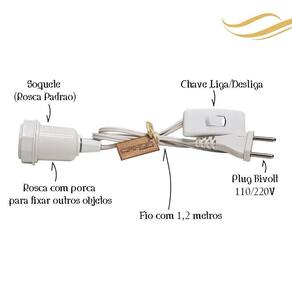 Fio de 1,2 metros. Interruptor liga/desliga tipo gangorra ; Plug 2 pinos padrão nacional ; Bivolt 110v/220v; Soquete e27 rosca padrão ; Potência máx.: 60w Bocal com rosca externa 32mm ; Ean: 7807490245774