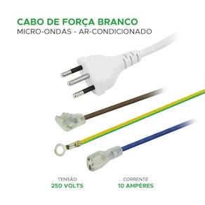 - Tipo: Cabo de Alimentação - Corrente Elétrica: 10A - Voltagem: 250V - Comprimento: 1,45 metro - Aplicação universal: Micro-ondas e ar-condicionados - Funções: Fornecimento de energia elétrica, estabilização de corrente Marca: Não Informado Ean: 7899744061414