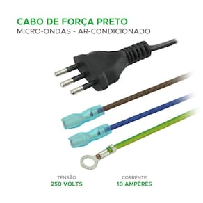 - Tipo: Cabo de Alimentação - Corrente Elétrica: 10A - Voltagem: 250V - Comprimento: 1,45 metro - Aplicação universal: Micro-ondas e ar-condicionados - Funções: Fornecimento de energia elétrica, estabilização de corrente Marca: Não Informado