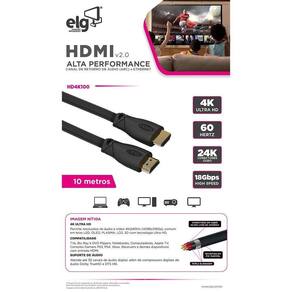 Cabo HDMI 2.0 4K High Speed 60Hz 10 Metros HD4K100 ELG - ARC Canal de retorno de áudio, Ethernet, 3D Ready Máxima fidelidade e performance livre de interferências na conexão de equipamentos eletrônicos. O HDMI 2.0 High Speed com Ethernet é uma tecnologia que une os canais de vídeo, áudio e dados em um único cabo HDMI. Combinando qualidade inigualável de sinal, conveniência de conectividade HDMI com poder e flexibilidade das redes de entretenimento doméstico. Incorpora um canal de dados dedicado para a ligação HDMI, permitindo a alta velocidade à rede bidirecional sem a necessidade de cabos exclusivos para Ethernet. CARACTERÍSTICAS TÉCNICAS :: Comprimento: 10 metros; :: Conectores Banhados a Ouro 24k; :: 18 Gbps HDMI 2.0 High Speed w/ Ethernet Tripla blindagem; :: Resolução 4K 60Hz 4096x2160P ; :: 3D Ready - Mantém o melhor do padrão 3D para uso com televisores e jogos; :: Suporta resolução HDTV - 4Kx2K - Resoluções acima de 1080p com alta definição também para projetores e fontes AV para um completo cinema digital em casa ; :: Canal de Ethernet 100 Mbps; :: Canal de retorno de áudio ARC - recurso que permite a transmissão do áudio da TV para o sistema de Home Theater usando somente a entrada HDMI sem necessidade de outro cabo exclusivo para áudio . EXTRAS :: 19 pinos + 1 terra para maior segurança; :: Oxygen free. INSTALAÇÃO :: Leia atentamente o descritivo antes de utilizar; :: Verifique a conexão indicada do produto. Acompanha o produto: 1 Cabo HDMI 10 metros : 1 ano junto ao fabricante Homologação Anatel: 164712304809 Marca: Não Informado