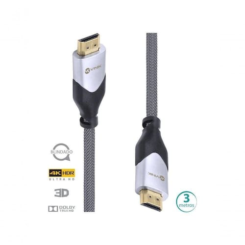 ** Assistir ao seu programa ou jogar seu jogo favorito com a máxima qualidade de som e imagem é tudo que o espectador deseja! A Vinik tem a linha completa de cabos HDMI 2.0, que transmite até você tudo que há de mais real em áudio e vídeo. ** Na versão 2.0, você pode mergulhar na qualidade 4K, a máxima resolução com todos os detalhes perfeitos, suporte 3D, além da qualidade do áudio: são nada menos que 32 canais suportados! ** Nesta versão, está disponível também a tecnologia HDR (High Dynamic Range), que nada mais é do que o perfeito balanceamento entre brilho e contraste, ou seja, transmite imagens mais vivas e reais. ** Alcance de 60 fps (quadros por segundo) em 4K (3840x2160 px) - a imagem nunca mais ficará distorcida. O HDMI 2.0 foi aprimorado a profundidade de cores: agora são 10bit, que em conjunto com a tecnologia HDR, maximiza a profundidade e qualidade das cores. ** Função Ethernet: tem vários dispositivos que utilizam internet? Se sim, bastar ter um único cabo de rede conectado a um dos dispositivos, o HDMI 2.0 trata de levar para você a comunicação em rede com os demais. ** Cabo com blindagem interna, dispensa uso de filtros ou ferrite para evitar ruídos, possuindo uma malha de alumínio que cria o isolamento para o cabo. Áudio e vídeo com perfeição. Dados técnicos: Resolução: 4k (3840 x 2160 px) Velocidade de transmissão: 18 Gbps Quadros por segundo (fps): 60 fps em 4k Suporta 3D: Sim Possui um canal de dados Ethernet 100 Mbps Sincronismo labial (Auto lip-sync): Sim Suporta aspecto 21:9: Sim Canais de áudio: 32 canais Frequência do sinal de áudio: 1536 MHz Áudio Dolby True HD: Sim Áudio DTS HD Master: Sim Canal de áudio reverso (Audio return channel): Sim Codificação de vídeo YCbCr 4:2:0: Sim Transmite dois canais de vídeo a 2 destinos: Sim Transmite 4 canais de áudio a destinos distintos: Sim AWG: 28 Revestimento: Nylon Conector: Dourado Blindagem: Sim Comprimento: 3 metros