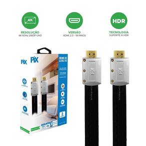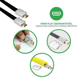 Cabo HDMI 2.0 flat desmontável com conectores 19 pinos. Suporta resolução 4K Ultra HD, HDR, áudio de alta definição e transmissão estável para jogos, TVs, monitores e aparelhos compatíveis. Design leve, flexível e fácil de transportar. Ideal para ambientes residenciais ou profissionais.