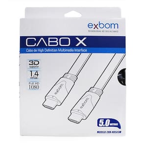 Cabo HDMI Achatado 5 Metros Suporte 3D Full HD 1080 Versão 1.4 | Marca: Exbom | Modelo: CBXHB50SM O formato achatado deste cabo HDMI é ótimo para economizar espaço, passar sob tapete, locais pequenos ou fixar em rodapés. Possui condutores banhados a ouro, protegido contra EMI, RFI e sobrecarga, o que garante transmissões de dados sem perda de sinal. Máxima qualidade nas experiências em alta definição Conecte com segurança aparelhos com saída HDMI a sua TV LCD, TV de Plasma, LED TV ou a outros aparelhos com entrada HDMI neste cabo de HDMI de 5 metros achatado. Especificações Comprimento: 5 metros Conexão: HDMI type A x HDMI type A Versão: 1.4 Blindagem tripla para máxima isolação a interferências externas Capa externa em PVC de alta qualidade e durabilidade Resoluções Compatíveis: 480i 480p 720i 720p 1080i 1080p Profundidade de bits de cor até 48 bits Suporta taxas de atualização de 60Hz, 120Hz e 240Hz Lossless Surround Sound 5.17.1 Conectores 24k Gold Plated Insuladores de polietileno FPE blindados por fita Mylar Taxa de dados máxima de 10,2 Gbps Suporte: Full HD / Lossless Audio T / Deep Color T Homologação Anatel: 030932206489 Ean: 7899718700981
