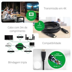 Referência do produto: 30301005003Vendido por clt shop Modelo: ch 2030Cor: pretoConteúdo da embalagem: 1 unidade: cabo hdmi ch 2030 versão 2.0 intelbrasInformações básicas: permite a transmissão de áudio e vídeo de alta qualidade através de uma única conexão. Descrição do produto:Transmissão em 4k: cabo hdmi versão 2.0, que proporciona mais qualidade de imagem e é compatível com televisores que transmitem imagens em 4k a 60 hz.Cabo com 3m de comprimento: o cabo hdmi possui 3m de comprimento, facilitando a conexão dos dispositivos.Compatibilidade: compatível com televisores, vídeo games, notebooks, desktops, projetores e toda a linha de cftv, multiplicadores, divisores e home & office intelbras.Blindagem tripla: maior resistência e proteção contra interferências externas. suporte a resolução 4k / 60hz largura de banda de 18 gbps compatível com tvs lcd, led, oled, qled, plasma, videogames, notebooks e projetores. permite o uso de funções inerentes a tecnologia hdmi, tais como cec e arc. conectores banhados a ouro suporte a ethernet cabo com comprimento de 3m blindagem tripla para maior proteção contra interferências externas versão 2.0Quem somos:Um e-commerce com selo de revendedor autorizado intelbras, atuamos nas áreas de segurança, telecom, redes acessórios e eletrônicos em geral.Sua satisfação garantida.Grupo clt shop.