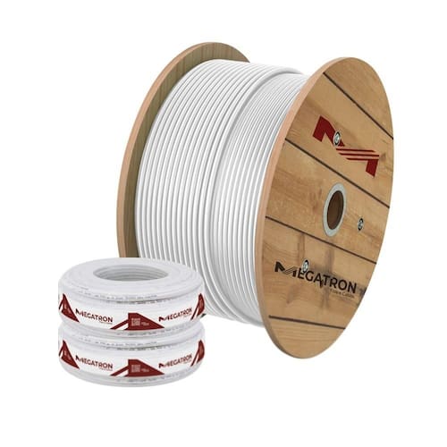 Características Principais: Marca: Megatron Comprimento: 100m Cor: Branco Porcentagem de malha: 67% Diâmetro nominal do condutor: 0,81 mm Diâmetro nominal da isolação: 3,7 mm Espessura nominal da capa: 0,70 mm Diâmetro nominal externo: 5,70 mm Impedância nominal: 75 ¿ Embalagem: Rolo