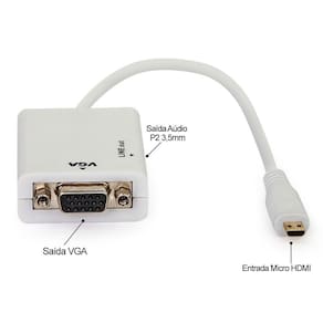 Cabo Micro Hdmi - Vga Com Áudio - Branco O Adaptador Micro HDMI para VGA Com Áudio permite ligar equipamentos com sinal digital: celulares modelos mais antigos e outros dispositivos com interface Micro HDMI a equipamentos com padrão analógico: projetor, monitor, TV e outros dispositivos que utilizam entrada VGA. Curta o melhor da tecnologia com os produtos da Cirilo Cabos Entrada: Micro HDMI Macho Saída Vídeo: VGA Fêmea Saída áudio: P2 de 3,5 mm Resolução: 720p/ 1080i / 1080p Cor: Branco Conteúdo da embalagem: 01 Adaptador Micro HDMI para VGA Com Áudio