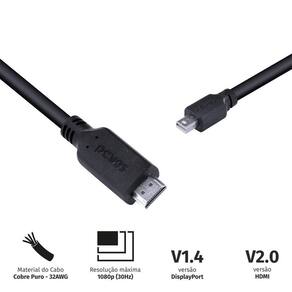 Dados Técnicos: Tamanho do cabo: 2 metros Material do cabo: cobre puro 32 AWG Resolução máxima: 1080p (30Hz) Duplo canal de áudio Versão DisplayPort: 1.4V HDMI: 2.0 Conectores HDMI macho e Displayport Macho Ean: 7908020918295