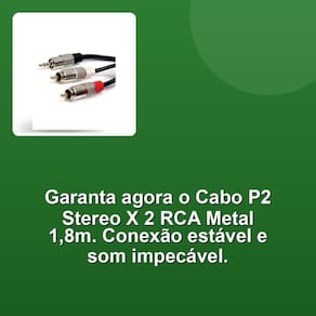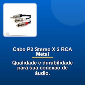 Este cabo não é apenas um acessório, mas um reflexo do nosso compromisso com a confiabilidade e a performance. Escolha o Cabo P2 Stereo X 2 RCA Metal 1,80 Metro e leve para casa um produto que combina funcionalidade, resistência e estilo. Transforme sua conexão de áudio em algo que você possa confiar e se orgulhar de utilizar.