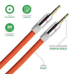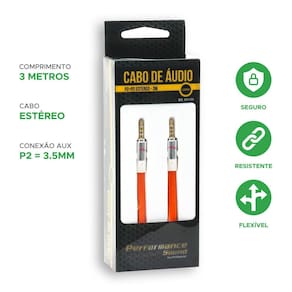 Os produtos performance sound são desenvolvidos para utilização e oferecem alto desempenho e mais fidelidade de som com menores índices de interferência. Cabos p2 + p2 estéreo: ideais para conectar seu mp3, mp4, ou celular a um aparelho de som automotivo com entrada auxiliar p2 aux . Conexão: p2 + p2 estéreo flat. Comprimento: 3 metros. Cor: laranja Canais: estéreo Embalagem: caixa Ponta: gold Série: premium Especificações técnicas: Cabo p2 + p2 estéreo flat - 3m - 100% cobre - laranja Homologação Anatel: 112672315857 Marca: Não Informado
