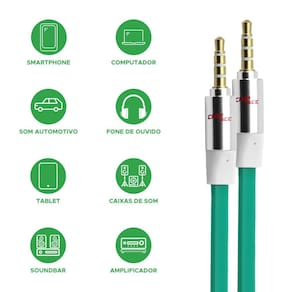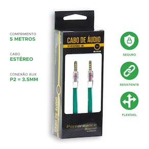 Os produtos performance sound são desenvolvidos para utilização e oferecem alto desempenho e mais fidelidade de som com menores índices de interferência. Cabos p2 + p2 estéreo: ideais para conectar seu mp3, mp4, ou celular a um aparelho de som automotivo com entrada auxiliar p2 aux . Conexão: p2 + p2 estéreo flat. Comprimento: 5 metros. Cor: verde Canais: estéreo Embalagem: caixa Ponta: gold Série: premium Especificações técnicas: Cabo p2 + p2 estéreo flat - 5m - 100% cobre - verde Homologação Anatel: 112672315857 Marca: Não Informado