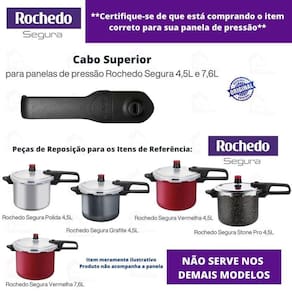 Cabo superior da panela de pressão rochedo segura 4,5 / 7,6 litros. O cabo é antitérmico que garante ainda mais segurança durante o uso, pois reduzem a propagação do calor. Acompanham os dois parafusos para fixar na panela. Atenção: não acompanha cabo inferior, alças, válvula de segurança e pino. Somente o cabo superior.