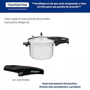 Nosso empenho é procurar o que há de mais atual e funcional no mundo culinário e para organização da sua casa, priorizando sempre a qualidade e a versatilidade dos produtos. Cabo superior para panela tramontina allegra 6l Cabo superior da panela tramontina allegra, o cabo é antitérmico que garante ainda mais segurança durante o uso, pois reduzem a propagação do calor. Atenção: não acompanha cabo inferior, alças, válvula de segurança e pino. Somente o cabo superior. Referencia: 62676/903 Não serve nos demais modelos. conteúdo da embalagem: 1 cabo superior tramontina allegra 6l 2 parafusos Gostou Esse produto pode ser seu aguardamos sua compra Marca: Não Informado