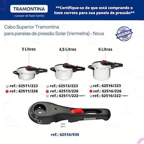 Nosso empenho é procurar o que há de mais atual e funcional no mundo culinário e para organização da sua casa, priorizando sempre a qualidade e a versatilidade dos produtos. Cabo superior para panela tramontina solar nova 3l / 4,5l / 6l Cabo superior da panela tramontina solar nova 3 /4,5/ 6 litros. O cabo é antitérmico que garante ainda mais segurança durante o uso, pois reduzem a propagação do calor. Acompanham os dois parafusos para fixar na panela. Atenção: não acompanha cabo inferior, alças, válvula de segurança e pino. Somente o cabo superior. Serve nos modelos: 3 litros: 62511/223 62511/226 4,5 litros 62513/223 62513/226 62511/222 vapor 6 litros 62516/223 62516/226 62516/222 vapor Referencia: 62516/930 Serve somente no modelo novo - detalhe vermelho Conteúdo da embalagem: 1 cabo superior panela tramontina solar nova 2 parafusos Gostou Esse produto pode ser seu aguardamos sua compra Marca: Não Informado