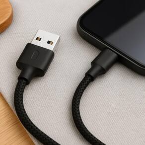 Cabo com malha externa em nylon para alta resistência contra dobras e puxões. Conexão Tipo C e USB-A. Função turbo com carregador compatível. Ideal para carregar e transferir dados.