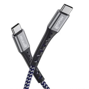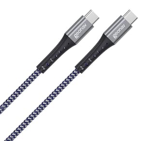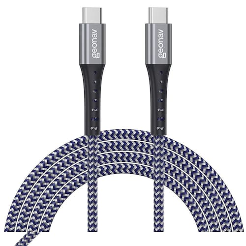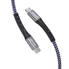 Cabo USB-C para USB-C com conector em alumínio anodizado, revestimento interno em Kevlar para maior resistência, trança em nylon com duas cores (azul royal e cinza), reforço na base do conector. Suporta carregamento rápido de até 100W e transferência de dados via USB 2.0.Tipo