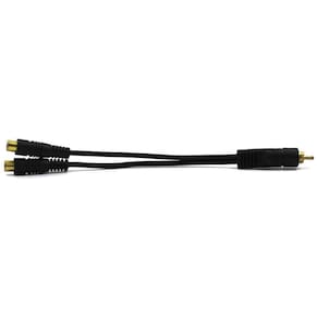 Cabo Y - 1 RCA Macho para 2 RCA Fêmea Gold Cabo utilizado para transformar uma entrada RCA Fêmea em 2 RCA Fêmea. Indicado para som automotivo, pois tem alta capacidade de condução, isolamento e blindagem. Conexões: 1 RCA Macho x 2 RCA Fêmeas Comprimento do Cabo: 24cm Homologação Anatel: 080281811799 Ean: 7895659479856