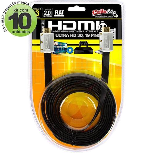 Cabos hdmi 2.0 flat desmontável - 3 mt kit com 10 Os cabos hdmi 2.0 flat desmontável,19 pinos, 4k, ultra hd, 3d tem pontas desmontáveis que facilitam a passagem por tubulações e conduites de até 3/4. Conta com tecnologia de ponta flat com maior facilidade na hora da instalação. Indicado para espaços pequenos, podendo ser dobrado sem prejudicar a qualidade de som e imagem digital. Cabo hdmi 2.0 flat desmontável,19 pinos, 4k, ultra hd, 3d de 3 metrosfácil instalação: ponta desmontável que facilita a passagem por tubulaçõese conduites de 3/4. Os cabos flat desmontáveis da cirilo cabos oferecemuma maior maneabilidade na hora da instalação, é indicado para espaçospequenos podendo ser dobrado sem prejudicar a qualidade de som e imagem.Especificações: Tamanho:3 metros. Compatibilidade:2.0 / 1.4 / 1.3b e todos os padrões hdmi anteriores Resolução de vídeo:576i, 576p, 720i, 720p, 1080p e 2160 - 4k60hz. Velocidade de transmissão:alta taxa de transferência: 18 gbps/s à 600mhz. Retorno de áudio 7.1:permite transmitir o áudio sem a necessidade de passar um cabo a parte. Imagens:compatível com todos os formatos atuais de 3d. Utilização:modelos como hdtv, home theater, vídeos games ps3, ps4, xbox, projetores,televisores lcd, led, dvd, receiver box, telões, blue-ray, entre outrosaparelhos com hdmi. Conectores:banhados a ouro 24k. Garantia:3 meses Conteúdo da embalagem:1 cabo hdmi 2.0 - 19 pinos