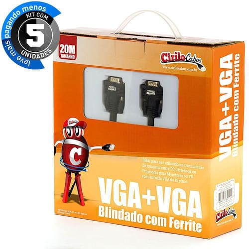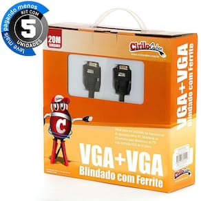 Cabos Vga Blindado - 20 Mt Cirilo Cabos - Kit 5 Imagine só... Você tem um PC numa ponta da sala e um projetor na outra ponta. A Cirilo Cabos tem a solução: Apresentamos o Cabo VGA + VGA com 20 Metros de comprimento. A metragem certa pra você fazer a ponte entre esses dois periféricos ou qualquer outro que use VGA nas duas pontas , sem precisar jogar o cabo no caminho.O cabo é ideal para fazer a transmissão de dados entre PCs, Notebooks e Projetores com entrada VGA de 15 pinos. Com trava para segurar o cabo conectado, dupla blindagem e filtro de ferrite, oferece muito mais segurança na transmissão.O cabo VGA + VGA blindado + Ferrite é importando da China com a qualidade Cirilo Cabos e é vendido em um Kit com 5 unidades.Características Gerais:Entrada/Saída: VGA Macho Blidagem: Dupla Filtro: Ferrite Garantia: 3 meses Comprimento do cabo: 20 metros Cor: Preto Conteúdo de cada embalagem: 1 Cabo VGA+VGA de 20 metrosCiriloCabos, cabo vga para ligar projetor, cabo vga para projetor, vga para vga, cabo vga, cabo vga blindado com ferrite, cabo vga blindado rolo, cabo vga blindado 20 metros.