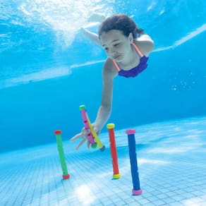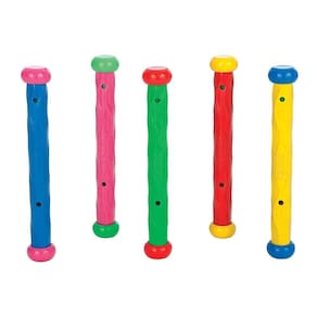 Caracteristicas: 05 Bastões Mergulho Recomendado para crianças maiores de 6 anos de idade Imagens meramente ilustrativas Material / Composição: Plástico Dimensões: Aproximadamente 18,5 cm de altura cada Somente utilize sob a supervisão de um adulto nadador