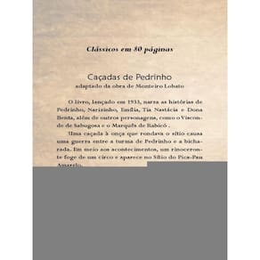 O livro, lançado em 1933, narra as histórias de Pedrinho, Narizinho, Emília, Tia Nastácia e Dona Benta, além de outros personagens, como o Visconde de Sabugosa e o Marquês de Rabicó . Uma caçada à onça que rondava o sítio causa uma guerra entre a turma de Pedrinho e a bicharada. Em meio aos acontecimentos, um rinoceronte foge de um circo e aparece no Sítio do Pica-Pau Amarelo. "Caçadas de Pedrinho" é um livro divertido e cheio de aventuras! Marca: ITAPUCA EDITORA *
