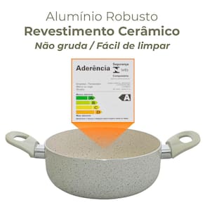 É produzida em alumínio na cor vanilla com revestimento cerâmico marble classificação A do Inmetro, não gruda, é mais fácil de limpar e mais saudável, pois necessita de menos óleo para o cozimento e é livre de metais pesados.
