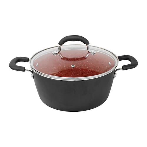 É produzida em alumínio preto fosco e revestimento cerâmico na cor vermelha marble, com a tecnologia Pro Ceramic Premium com classificação A do Inmetro, não grudam, são mais fáceis de limpar, mais saudáveis, pois necessitam de menos óleo para o cozimento e livres de metais pesados.