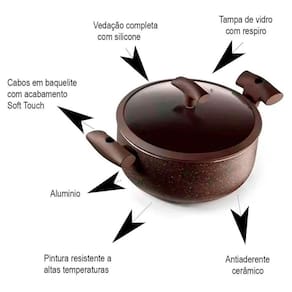 • Revestimento interno: Antiaderente cerâmico. • Cabos isotérmicos, não esquentam. • Tampa de vidro temperada, com saída para vapor e bordas de silicone. • Uso recomendado: Fogão convencional, fogão de indução, fogão halogênio e forno até 180°C. • Não levar ao micro-ondas, geladeira e freezer. • Pode ir a lava-louças, porém ter o cuidado na colocação com relação aos outros itens, evitando batidas e arranhões que podem danificar o produto na lavagem.
