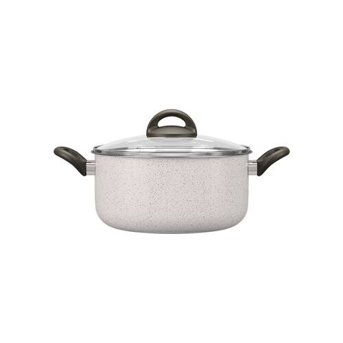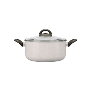 A tampa de vidro temperado com saída de vapor permite acompanhar o preparo sem abrir a panela, enquanto os cabos e pomel de baquelite com 50% de resíduos reutilizados não aquecem, proporcionando mais segurança. O acabamento na cor Vanilla com grânulos cinzas traz charme e requinte à decoração da sua cozinha.
