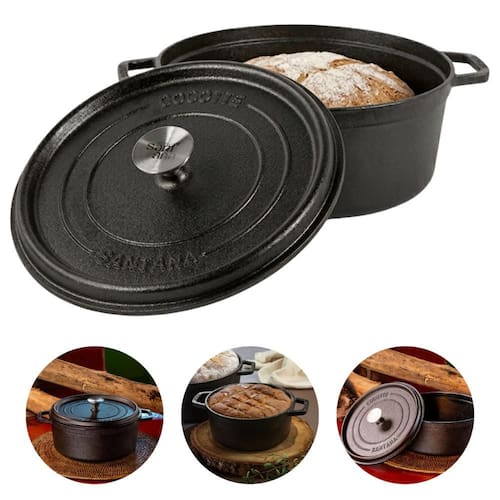 Sua tampa também permite a colocação de brasas na parte superior, possibilitando um preparo mais uniforme em receitas assadas. Além disso, devido ao seu batoque de ferro, apresenta alta resistência ao calor e pode ser utilizada em diferentes fontes de calor, inclusive no forno. Essa característica também torna a cocotte uma ótima opção para o preparo de pães.