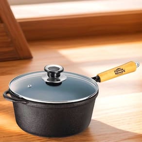 Caçarola Emily Cabo Madeira Panela Mineira Tampa Vidro 16cm A Caçarola Emily Cabo de Madeira e Tampa de Vidro da Panela Mineira possui um design aperfeiçoado, fundo reto preto, bordas alongadas e tampa moderna. Com excelente distribuição e retenção de calor característico do ferro fundido, esse produto se torna ideal para assar, grelhar, fritar e cozinhar. Seu formato redondo é muito utilizado para o preparo de arroz, bife, frango, feijão, carnes e legumes, cozinhando os alimentos uniformemente, de maneira lenta e com muita maciez, o que garante ainda mais sabor e qualidade às receitas. Onde Usar: Pode ser utilizado em fogões a gás, a lenha, elétricos, cooktops de indução e vitro-cerâmicos. O cabo de madeira não permite que o produto seja levado ao forno, churrasqueira ou fogo de chão. Orientação de Uso e Conservação:Antes do primeiro uso: Lave com água e sabão, seque bem com um pano e leve ao fogo para remover toda a umidade. Já vem pronta para uso, então não precisa ser curada. Guarde em um local seco. Após cada uso: Lave com água e sabão, usando uma esponja ou escova para remover todos os resíduos de alimentos. Se restarem resíduos, ferva água com um pouco de detergente para soltá-los. Pintura: Revestimento atóxico que garante durabilidade e proteção prolongada, sem causar nenhum dano à saúde. Características Técnicas e Medidas:Altura com Tampa: 14cm.Altura sem Tampa: 8cm.Material: Ferro Fundido.Modelo: Redonda.Diâmetro: 16cm.Linha: Tradição.Cabo: Madeira.Litragem: 1,2L.Chapa: Lisa.Peso: 2Kg. Itens Inclusos: 01 Caçarola Emily Cabo de Madeira Panela Mineira 16cm 1,2L.01 Tampa de Vidro Temperado Panela Mineira 16cm.01 Batoque em Platinela. Código: 382PMProdutoLojaPlast.
