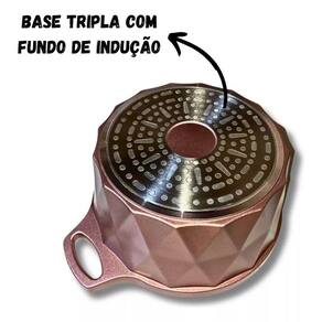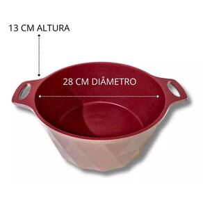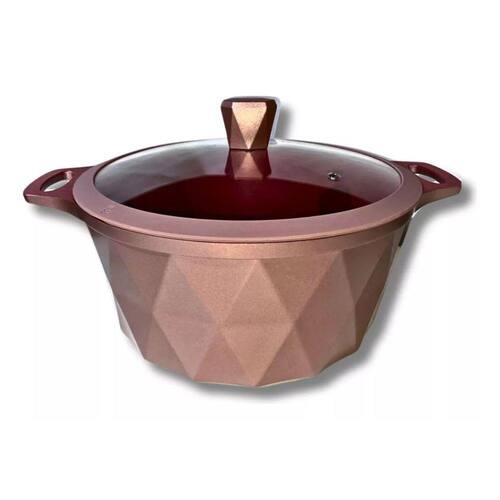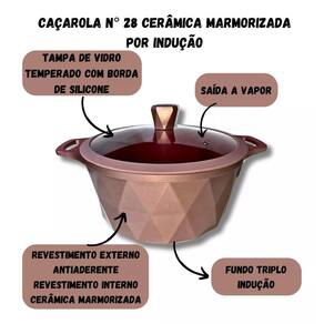 *Caçarola n°28cm Diâmetro Antiaderente Cerâmico Marmorizado Fundo Triplo para Indução com, tampa de vidro temperado com Saída de vapor; *Alumínio Injetado com fundo triplo por indução de alta qualidade, espessura de 5 mm, que confere ao item uma estrutura resistente garantindo a durabilidade e distribuição eficiente do calor; *Revestido com Antiaderente externamente, e internamente com Cerâmica Marmorizada *Possui cabo reforçado, feito em baquelite, material antitérmico que retém calor, para garantir máxima segurança no manuseio; *Revestimento externo: Antiaderente - Cor Rosê; *Revestimento interno: Cerâmica Marmorizada - Cor Vermelho.