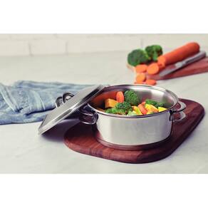- Por contar com um fundo triplo (aço inox + alumínio + aço inox), ela garante que os alimentos sejam cozinhados de forma uniforme, além de mantê-los quentes por mais tempo.