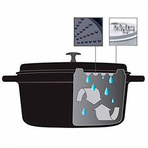 A tampa da Caçarola Hercules possui sistema pinga gotas, que auxilia no e na hora de servir. E o seu fundo especial permite o em todos os tipos de fogão, como fogão convencional a gás, indução e halogênio.